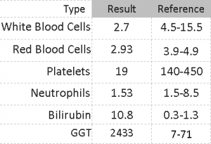 I think the GGT level in the next two days will help them make a decision. If it continues to go down, we could be on our way “H” (I am afraid to use the whole word). If it does not come down, I think we really will have to do a biopsy to know what to treat.