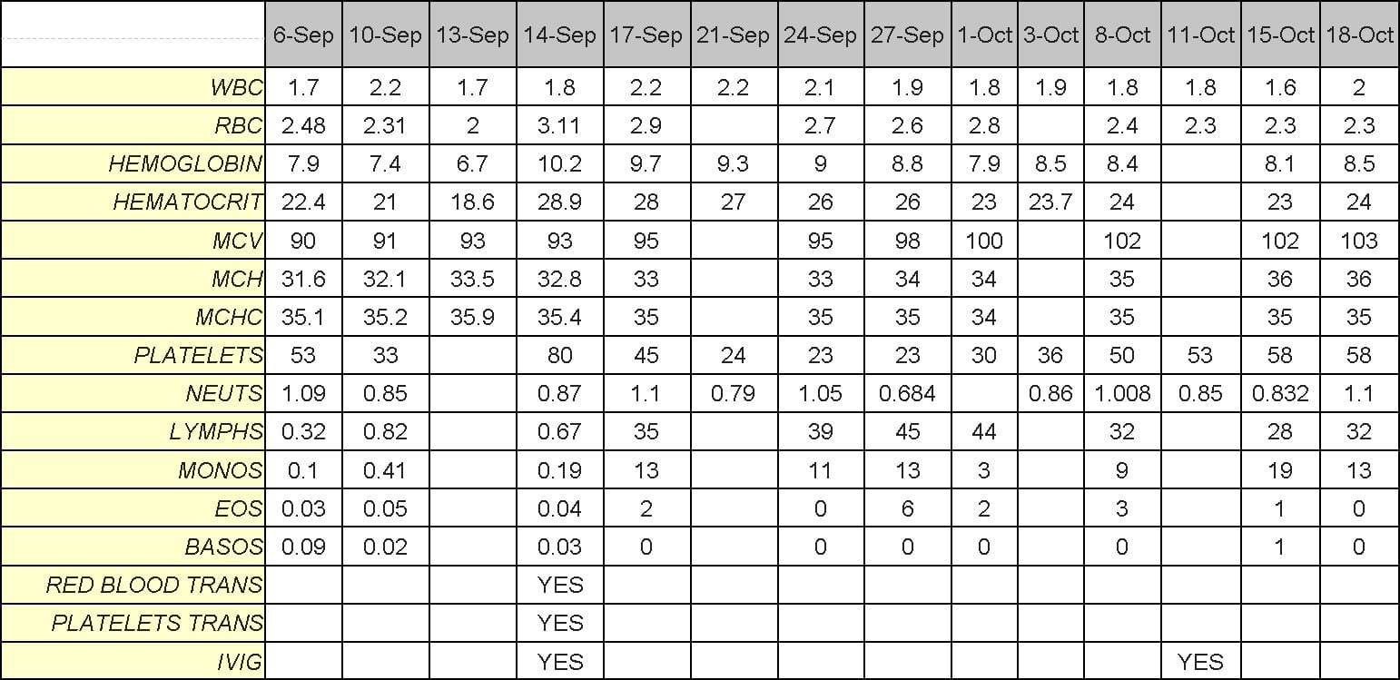 I think Doctor Cowan is also becoming slightly concerned. He would like to talk about another bone biopsy soon to see what is actually happen in the marrow. There is a chance they would give Robert more bone marrow from his donor (they have the extra marrow store right now). With the other bone marrow transplant children with this syndrome was this also the case, that it took a long time for the white blood counts to raise again?